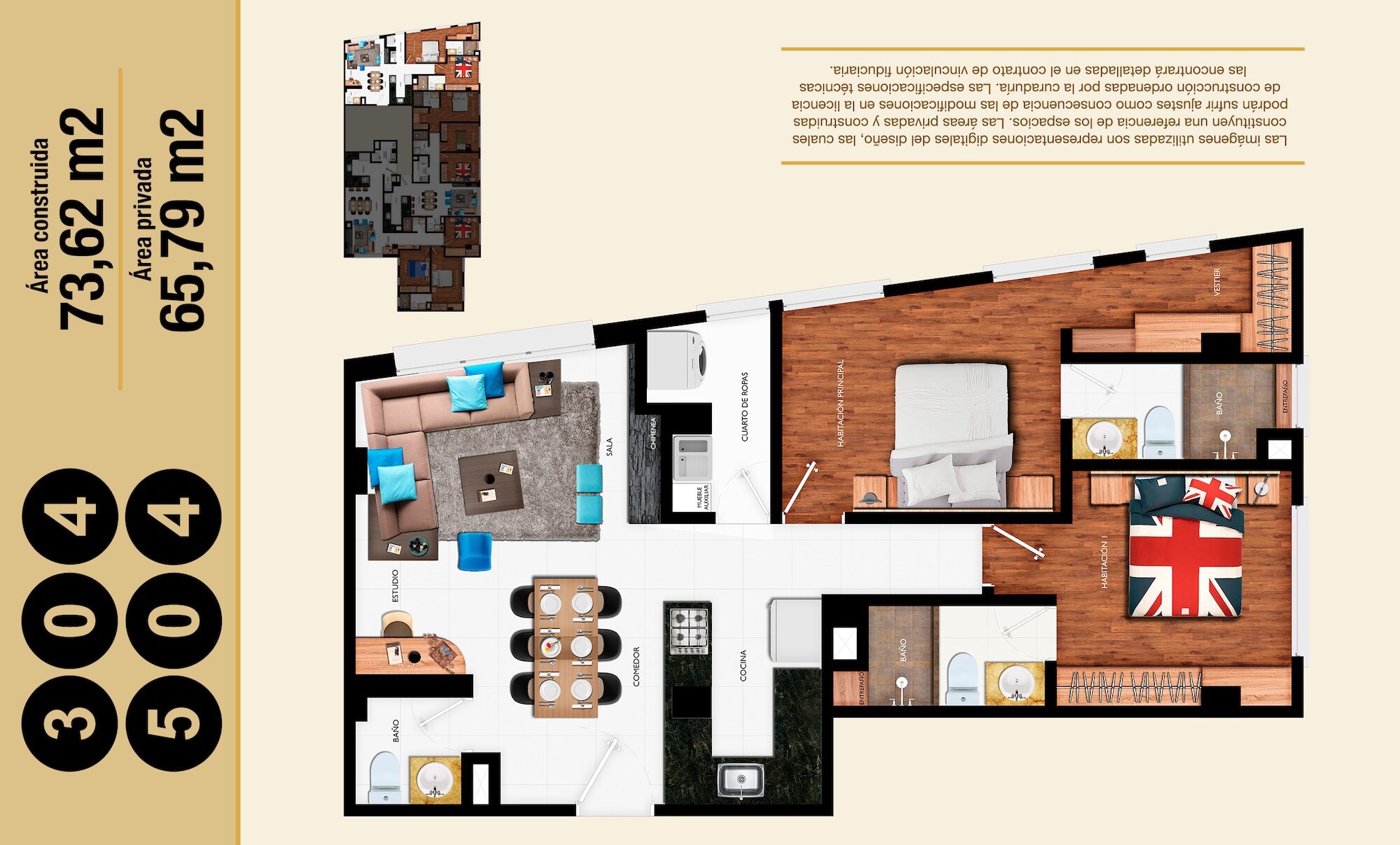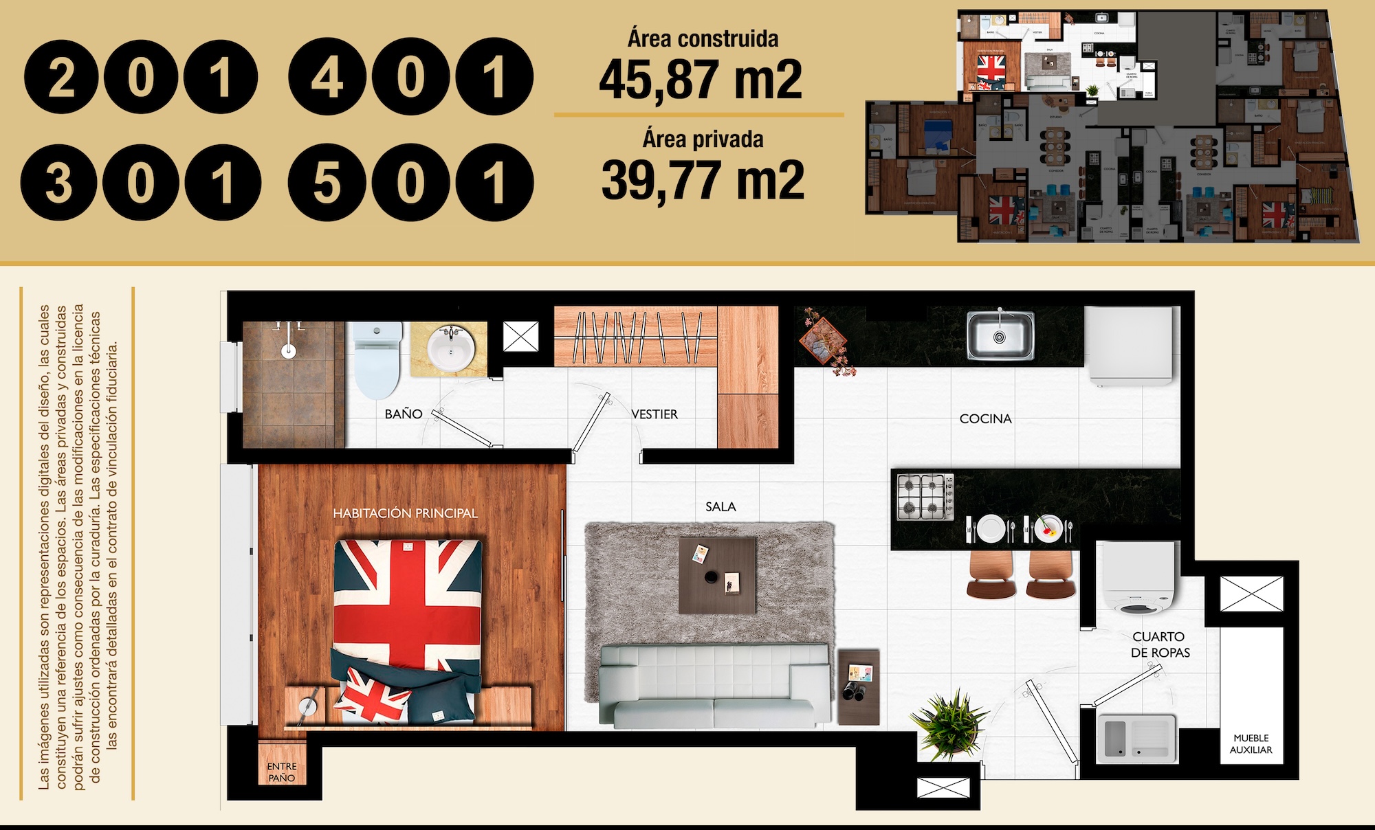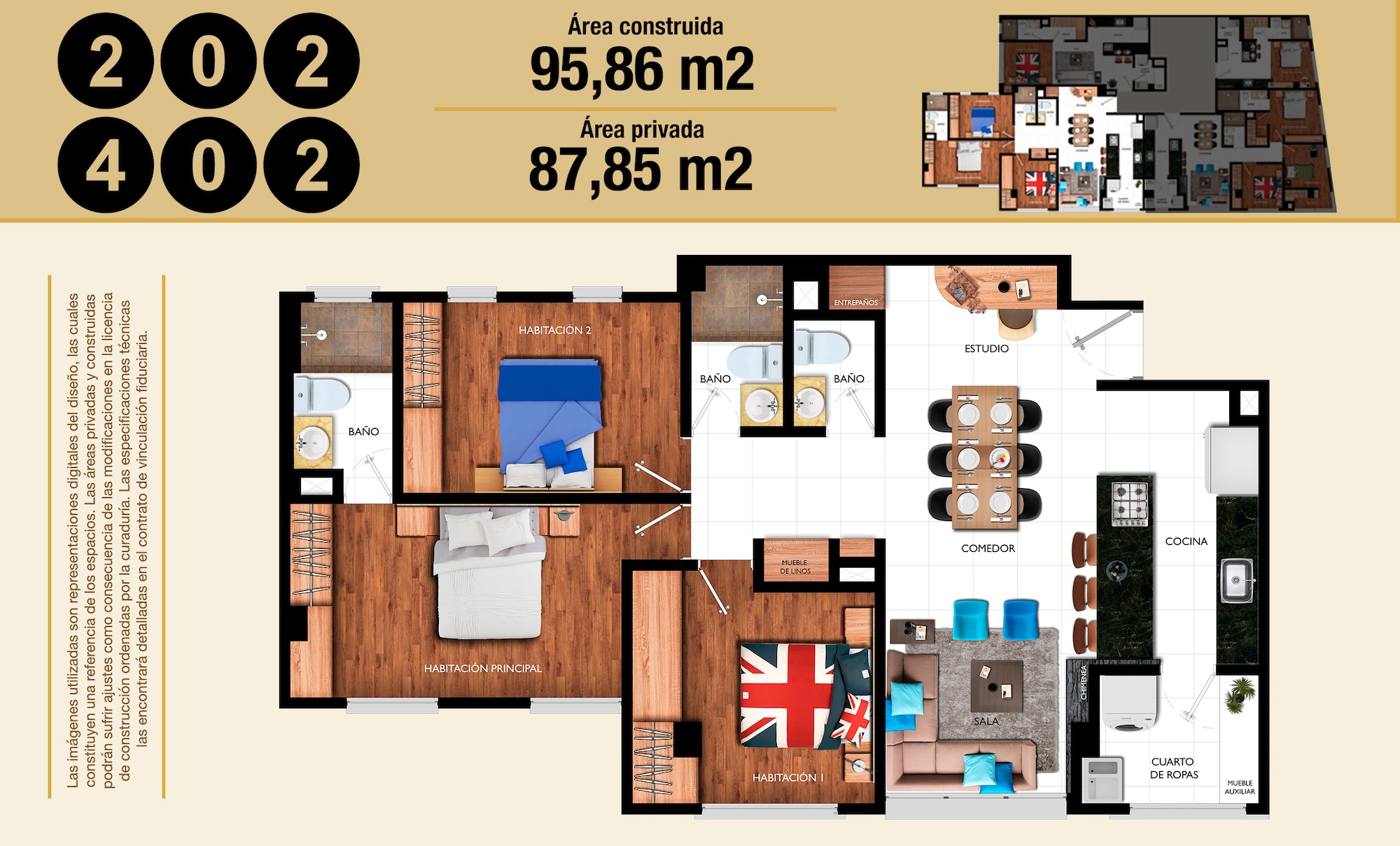 *Imágenes de referencia del proyecto, especificaciones y detalles arquitectónicos sujetos a cambios por proceso de licenciamiento y constructivo. Los apartamentos no se entregan con los elementos de decoración ni el mobiliario. Pregunte en sala de ventas por el detalle de acabados.
